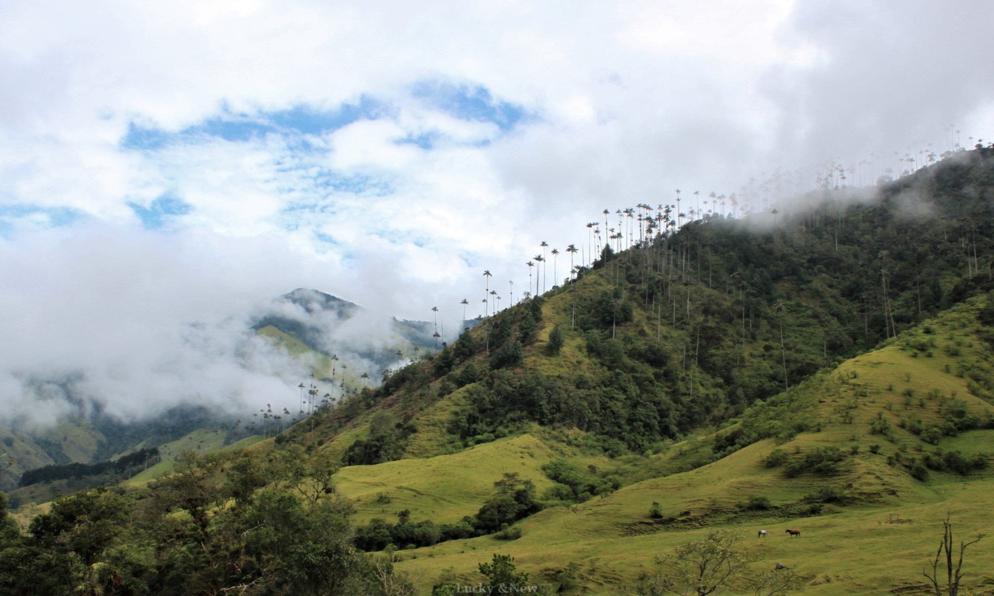 The walk thereafter to the wax palm trees was easy, mostly downhill and on a clearly defined path. There were a glimpses of the trees along this path, which provided a lot of motivation to keep going and the improving weather also kept spirits high. After a while, we turned a bend and the wax palms were visible in all their glory. I was in wonderment. The palm trees were breathtakingly beautiful and it was amazing to see them spotted aross the mountains.